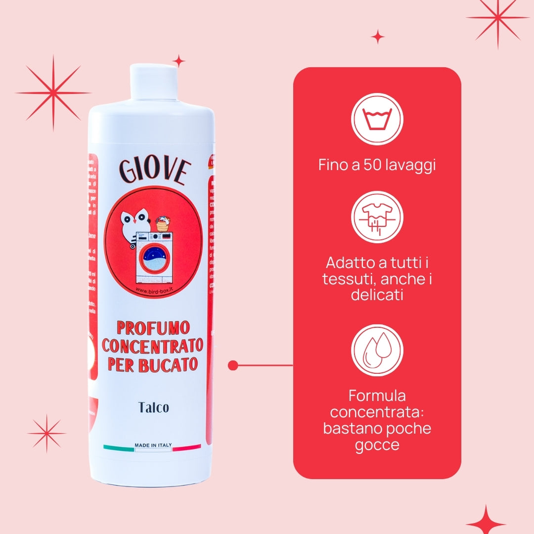 Il calore rassicurante del talco incontra la freschezza di un bucato appena lavato. Giove dona una fragranza pulita e avvolgente, perfetta per chi cerca comfort e morbidezza in ogni lavaggio.